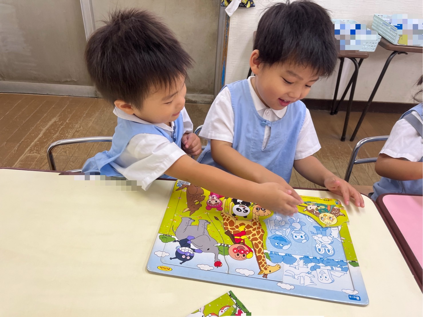 ⭐︎感触遊び⭐︎ 氷を触って冷たさや気持ちよさを感じながら喜んでいました! パズル遊び パズルは初めての子どももいたので簡単なパズルからやり方を教えて遊びました!「できた」ことで達成感をもちピ …
