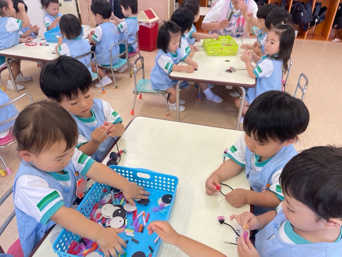 ストローて紐通し遊びをしました。いくつも入れて夢中の子どもたちでした!