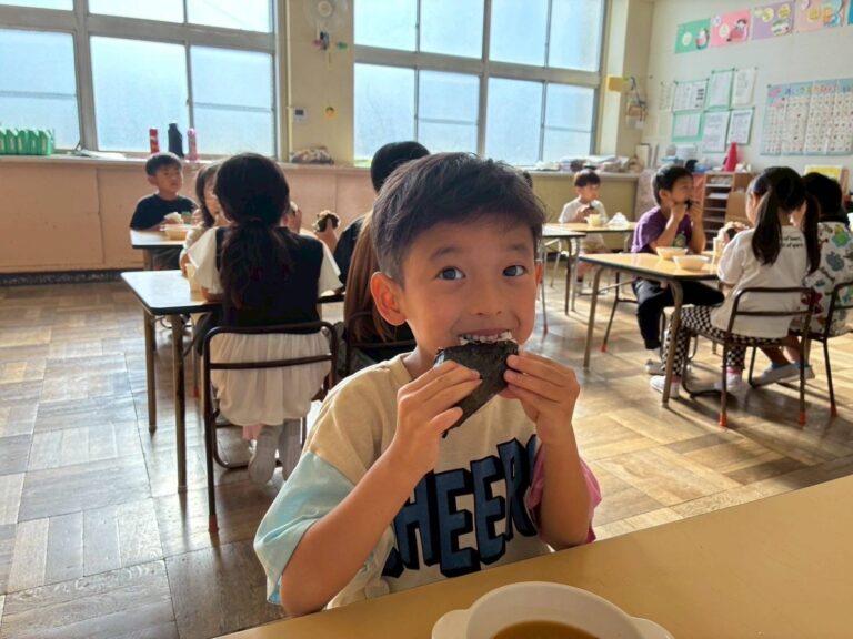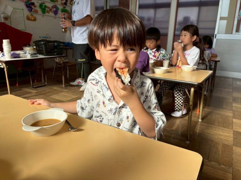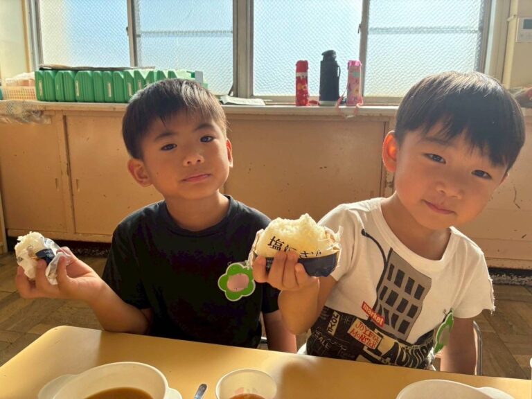 作ったかばんを持って、コンビニにおにぎりを買いに行きました。自分で選んで買ったおにぎりを美味しそうに食べていました。