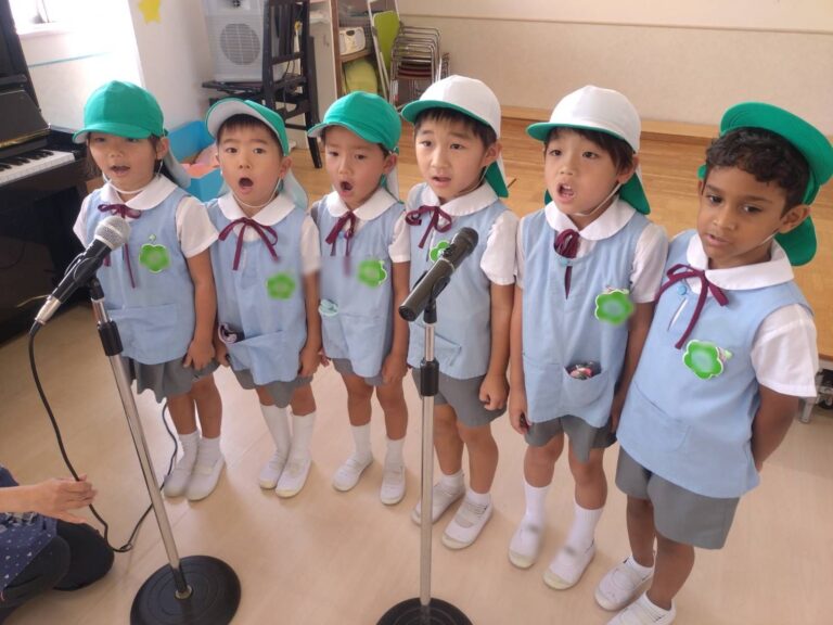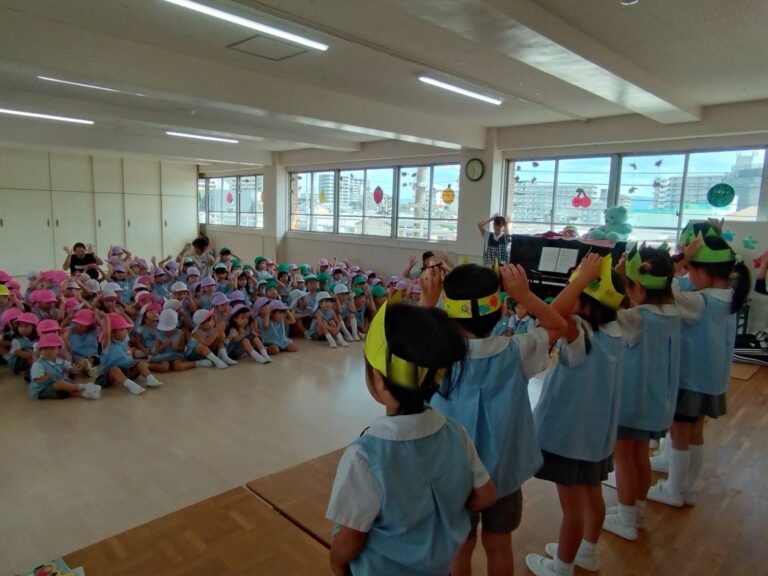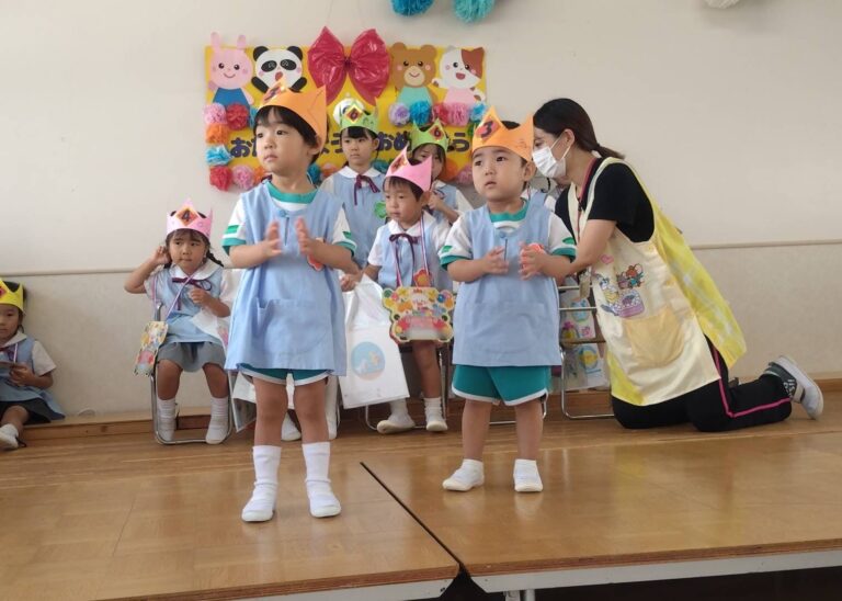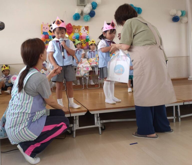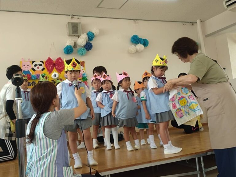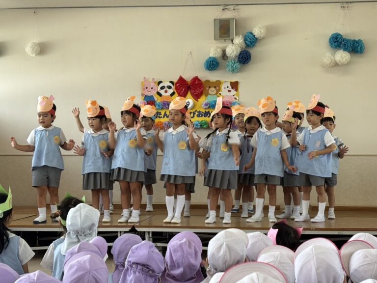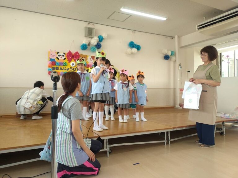 9月 お誕生会(平野愛和学園) 2025年9月22日 9月のお誕生会をしました。司会のお友だちの「これからお誕生会をはじめます」の元気な声でお誕生会が始まりました♪お誕生日のお友だちが自己紹介をしました。年長組はカッコよく将来の夢も教えてくれました‼年中・年少組も緊張しながらもクラスや名前を言っていました。すみれ組は歌に合わせて名前を発表してくれました。写真撮影の後には、お誕生日のお友だちが「ミッキーマウスマーチ」に合わせて可愛く踊りました♪最後にゆり組が「3びきのこぶた」の歌に合わせて手遊びを披露し、お祝いしました。 お誕生児も見ている子もみんなで楽しくお祝いすることができました☆