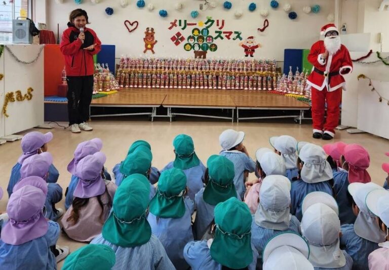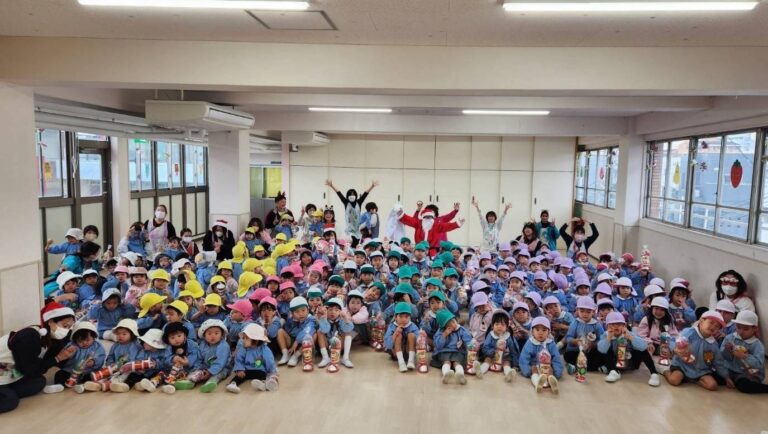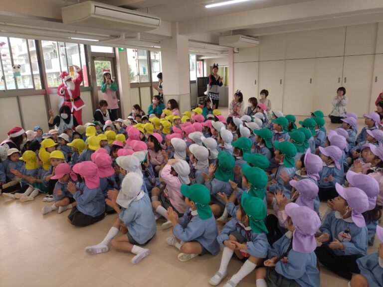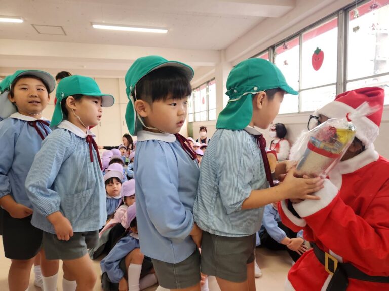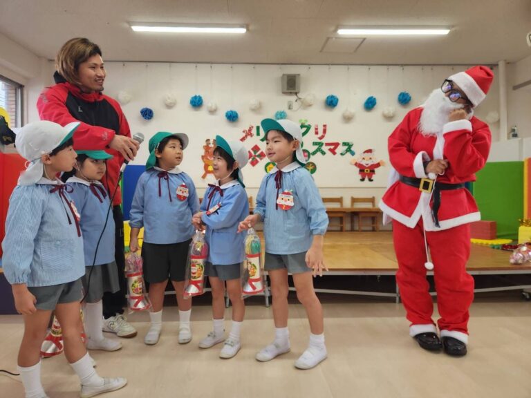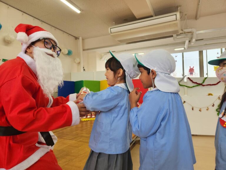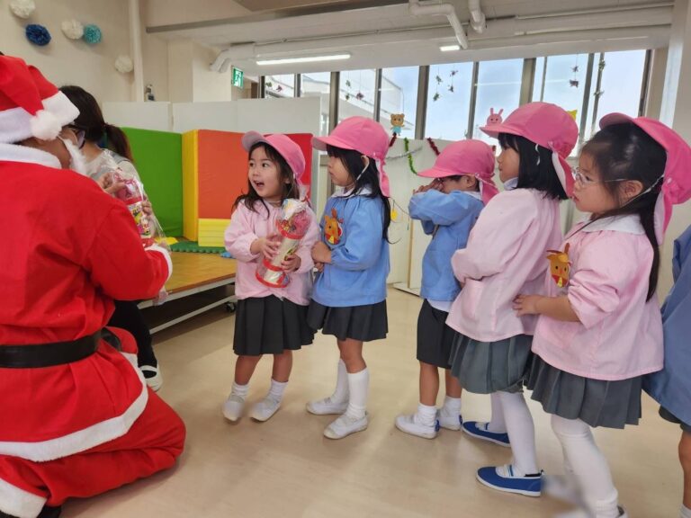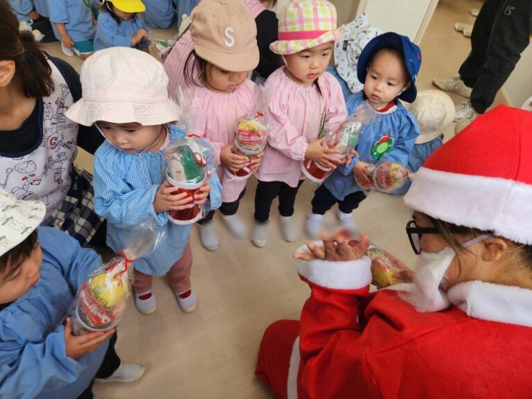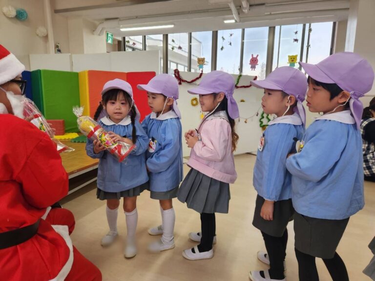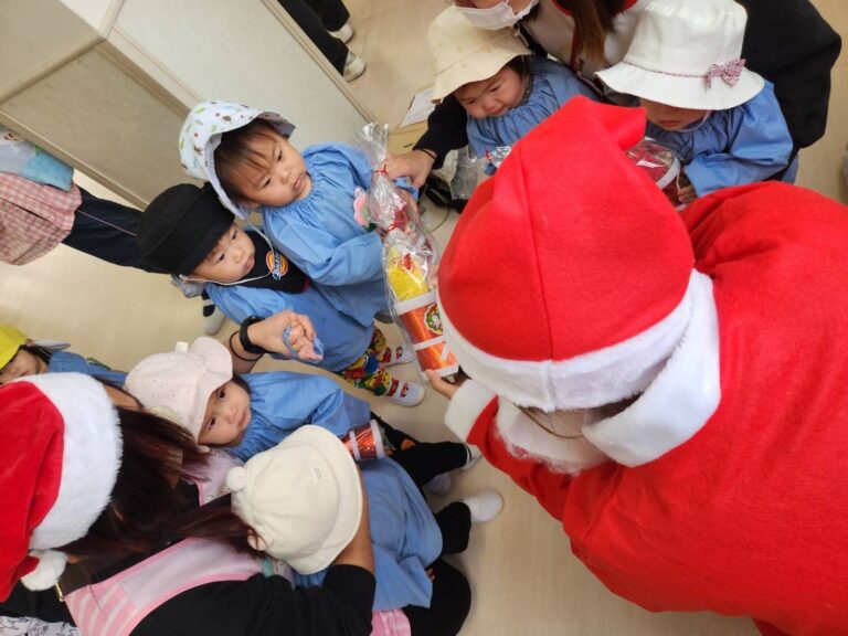 クリスマス会(平野愛和学園) 2025年12月26日 クリスマス会をしました🎄サンタさんの登場に、目を丸くしたり笑顔になったりと、さまざま表情を見せる子どもたちでした♡ サンタさんから、一人ひとりにプレゼントをもらいました☆ ・サンタさんは何歳ですか?・いつも夜に大変なお仕事ありがとうございます。・プレゼントありがとう!などと、サンタさんに質問したり、お礼の言葉を言ってくれましたよ。欲しいおもちゃもお願いするかわいい姿もみせてくれました。 保護者からの出し物は「はらぺこあおむしクリスマスバージョン」でした。サンタ帽をかぶったあおむしが登場すると、子どもたちは目をキラキラさせながら夢中で見ていましたよ。 皆で記念撮影をしてから、来年もきてね~♡とお願いしました。 クリスマス会では、子どもたちが生き生きと楽しむ姿が印象的でした。笑顔あふれる素敵な会となりました!