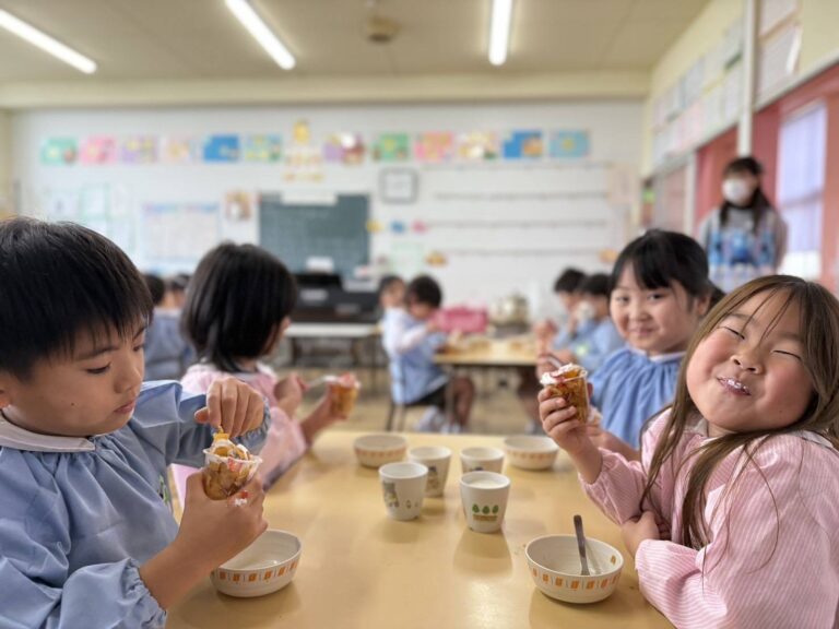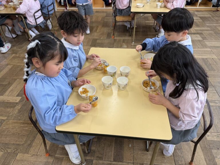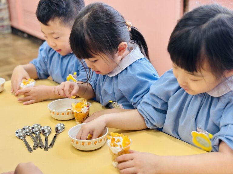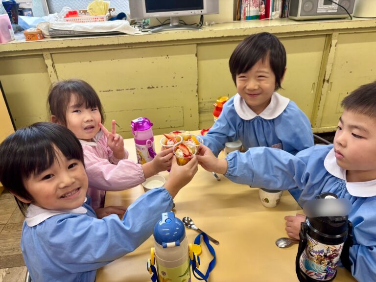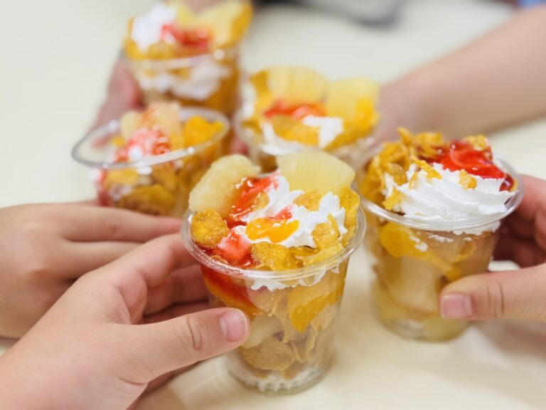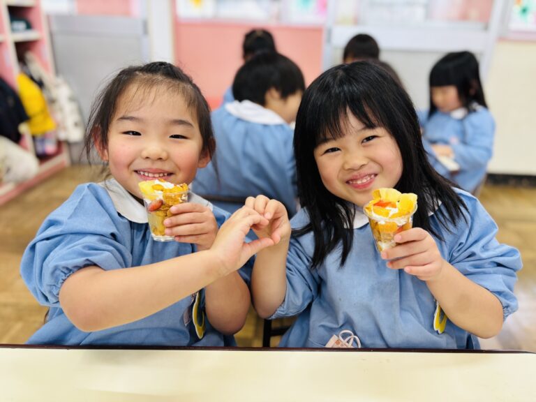 幼児組はカップにコーンフレークやフルーツなどをトッピングしてオリジナルパフェを作りました。