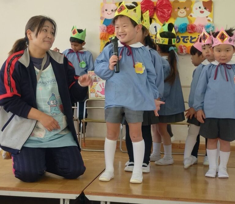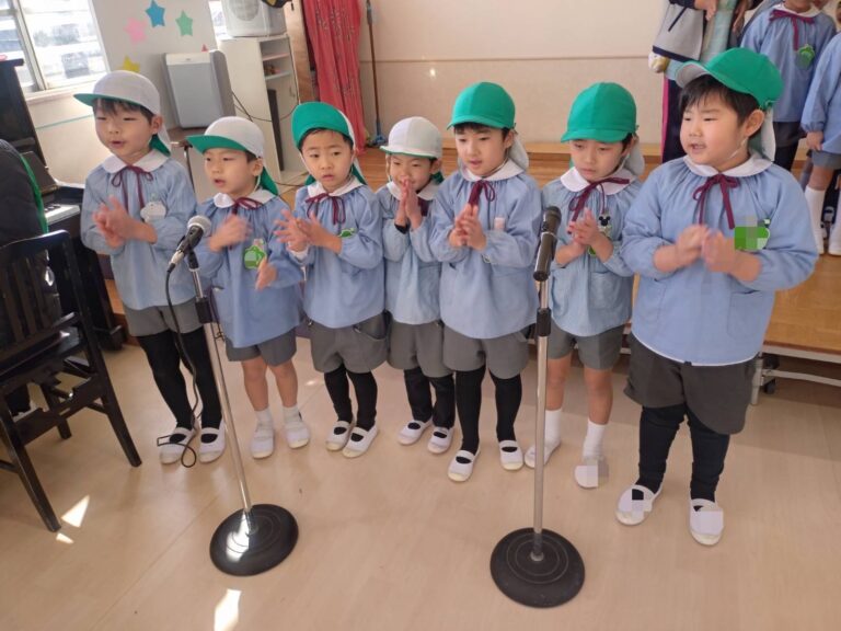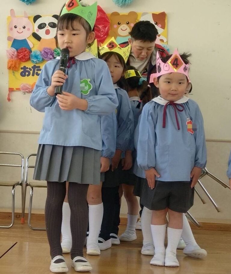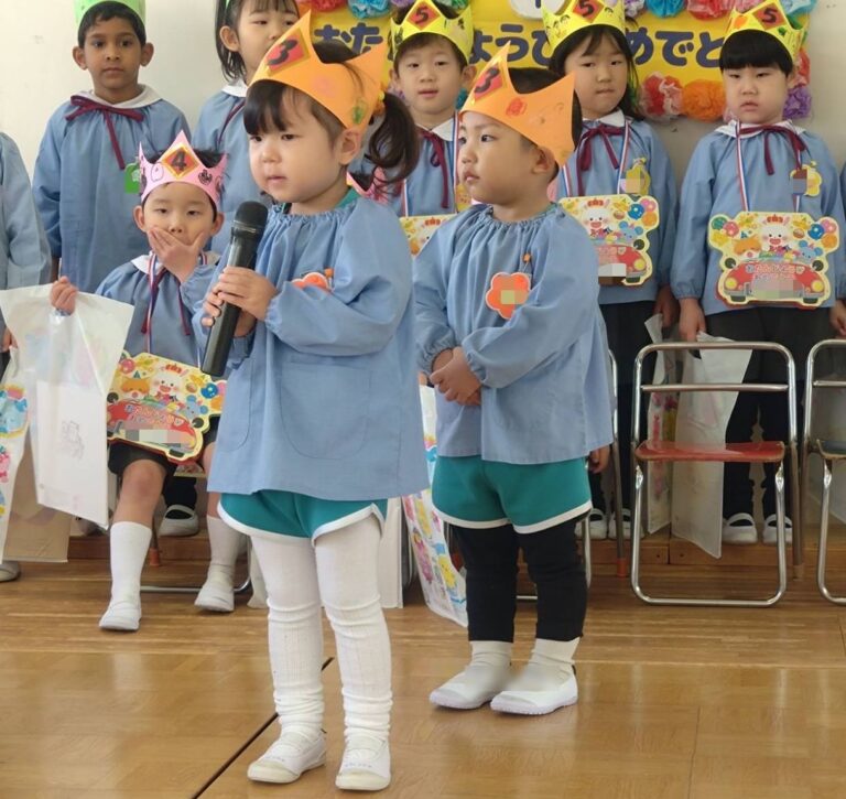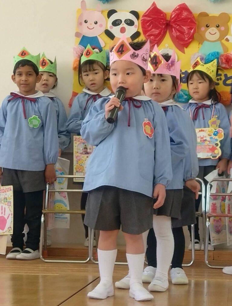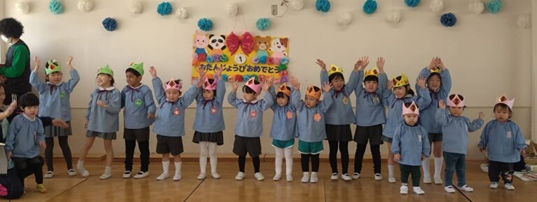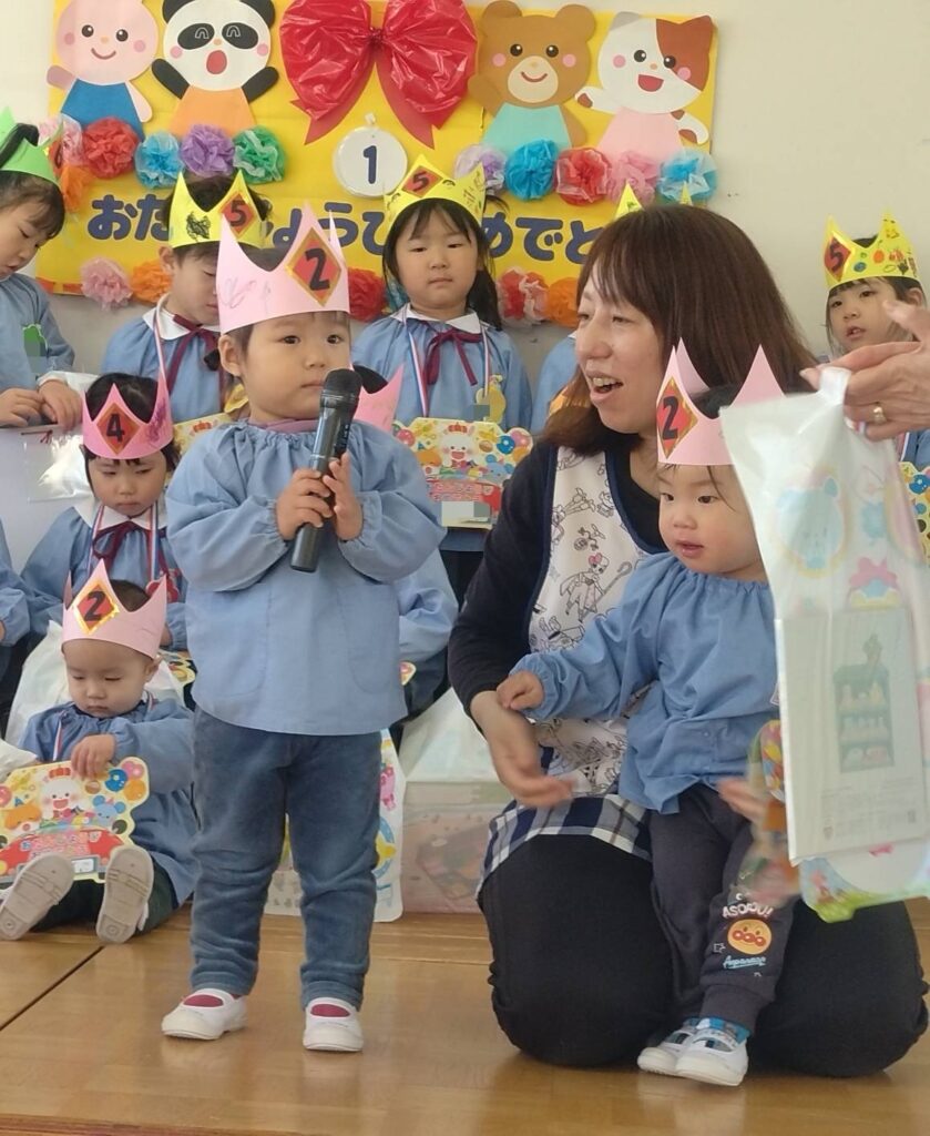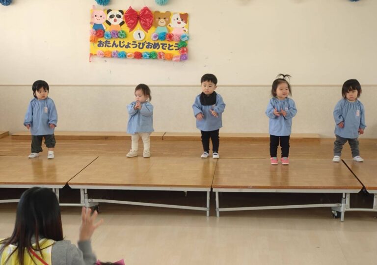 1月 お誕生会(平野愛和学園) 2026年1月28日 年長組の司会でお誕生会が始まり、お誕生月の子どもたちは大きな声で発表することができました。すみれ組さんも将来の夢を発表することができましたよ。 クラス発表は、つくし組0歳組の体操でした。みんな楽しそうに体を動かしていて、見ている子ども達や保育士をメロメロにしていましたよ♡