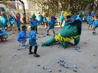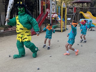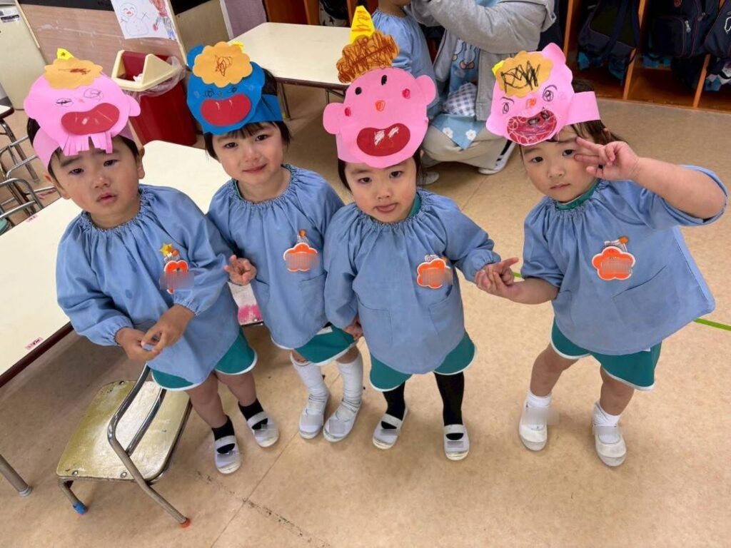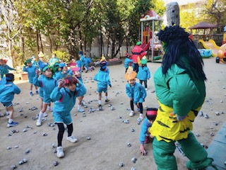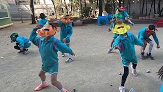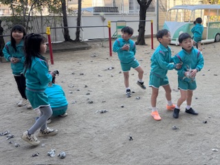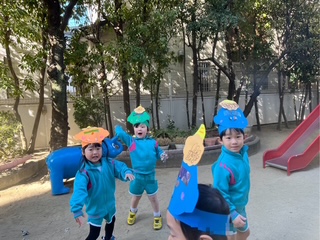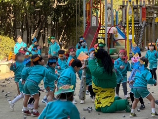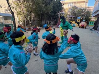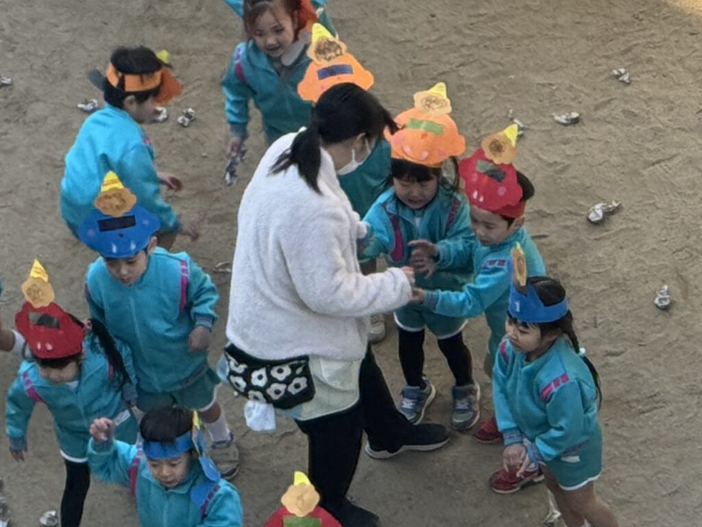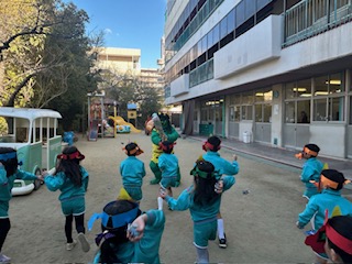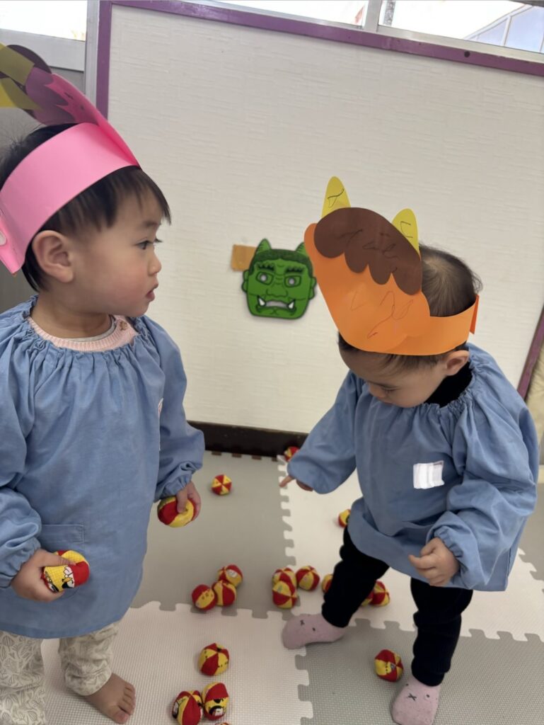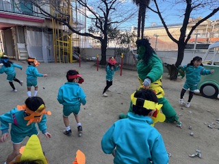 節分『豆まき』 (平野愛和第三学園) 2026年2月6日 年も明けてあっという間に1ヶ月!今日は 節分の日。みんなで豆まき遊びをしました。誤嚥防止のために新聞紙を丸めた物で代用。この日のために子ども達がせっせと作りました。 『おにはそと〜ふくはうち〜🎵』のお歌を朝礼でうたって、お面をつけて新聞紙の豆を持って『よぉーし!鬼をやっつけるぞ!』と準備万端! サフラン組 子ども達は、自分達で作った鬼の面を被り全員が鬼のはずですが・・・いざ本物の鬼(?)が登場すると、鬼退治側に早変わり。豆まきの前に『おにはそとー!ふくはうちの!』の練習もしたのに…聞こえてくるのは『まてー!』『おにはそと!おにはそと!』ばかり…あれっ?ふくは〜うちは? 鬼をやっつけて、『よっしゃー!』余裕のポーズです⭐︎強かったね!サフラン組さん♪ みんなでしっかり『おにはそと〜!ふくはうち〜!』も出来ました。 クロッカス・カンナ組 サフラン組さんの豆まきを見ながら、大きな鬼にドキドキ…ハラハラ…サフラン組さんに『がんばれ〜!』と応援してもらってさぁ!豆まきだ〜! 『あっ…』『こわい〜』と小さな声も聞こえてきましたが、先生のかげに隠れながらも勇気をだして鬼さんをやっつけることができました。 ポピー・チューリップ組 お面をつけてお部屋で節分遊びをしたり鬼をお部屋の前からすこし見たり…小さくてかわいい鬼さんがいっぱいです。 遊んだあとの新聞紙のお片付けもみんなで協力してできました。豆まき遊びでは勇敢に豆を投げる子、逃げ回る子と様々な光景が見られ、それはそれは賑やかな豆まきでした。元気に豆まきをして子ども達の心の中の悪い鬼をやっつけることが出来ました。今年も健康に過ごせそうです。