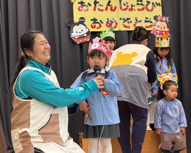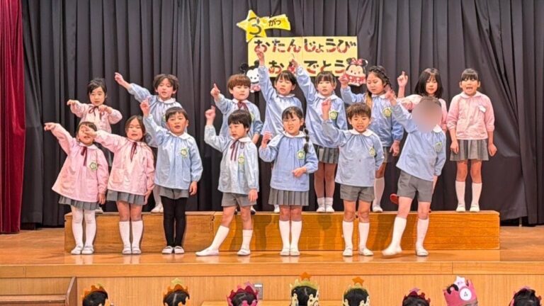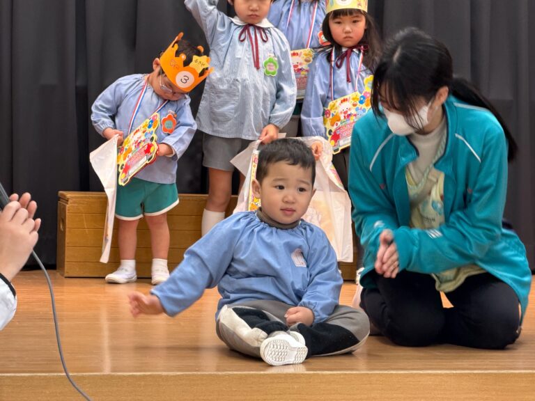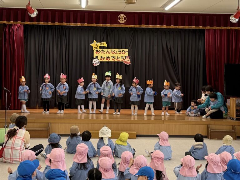 ☆2月・3月 お誕生会☆(平野愛和第二学園) 2026年3月13日 インフルエンザ流行のため延期していました2月のお誕生会を3月のお誕生会と合わせて行いました。お誕生児さんは、舞台に立って自分のクラスや名前、将来の夢を教えてくれました! 人前に立つのは恥ずかしくて泣いてしまったり、将来の夢などがうまく言えなくなってしまう子がも居ましたが、先生が寄り添い、再チャレンジしてみると、上手に発表できていました。子ども達の成長を感じるお誕生会でした。 今年度最後のお誕生会。クラスの出し物では年長のまつ組さんが歌やメッセージなどを披露してくれました。もうすぐ1年生になる子ども達は舞台の上で、お兄さんお姉さんとして輝いていました。年長組を見守る子どもたちも静かに集中して発表を見ていました。