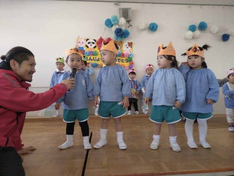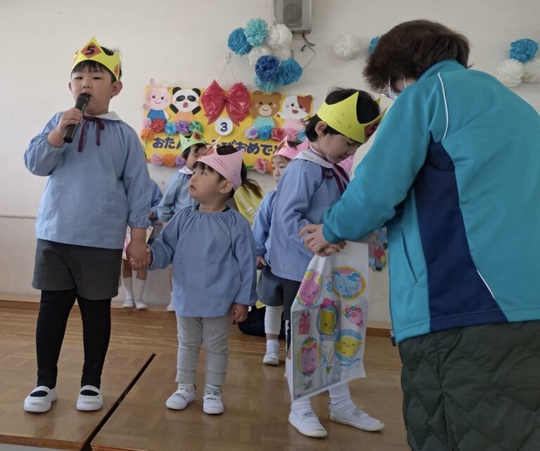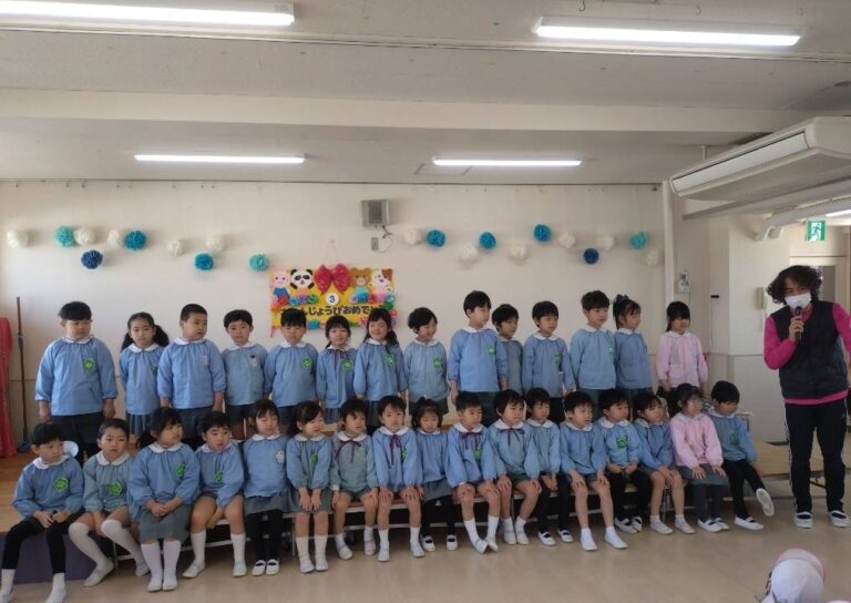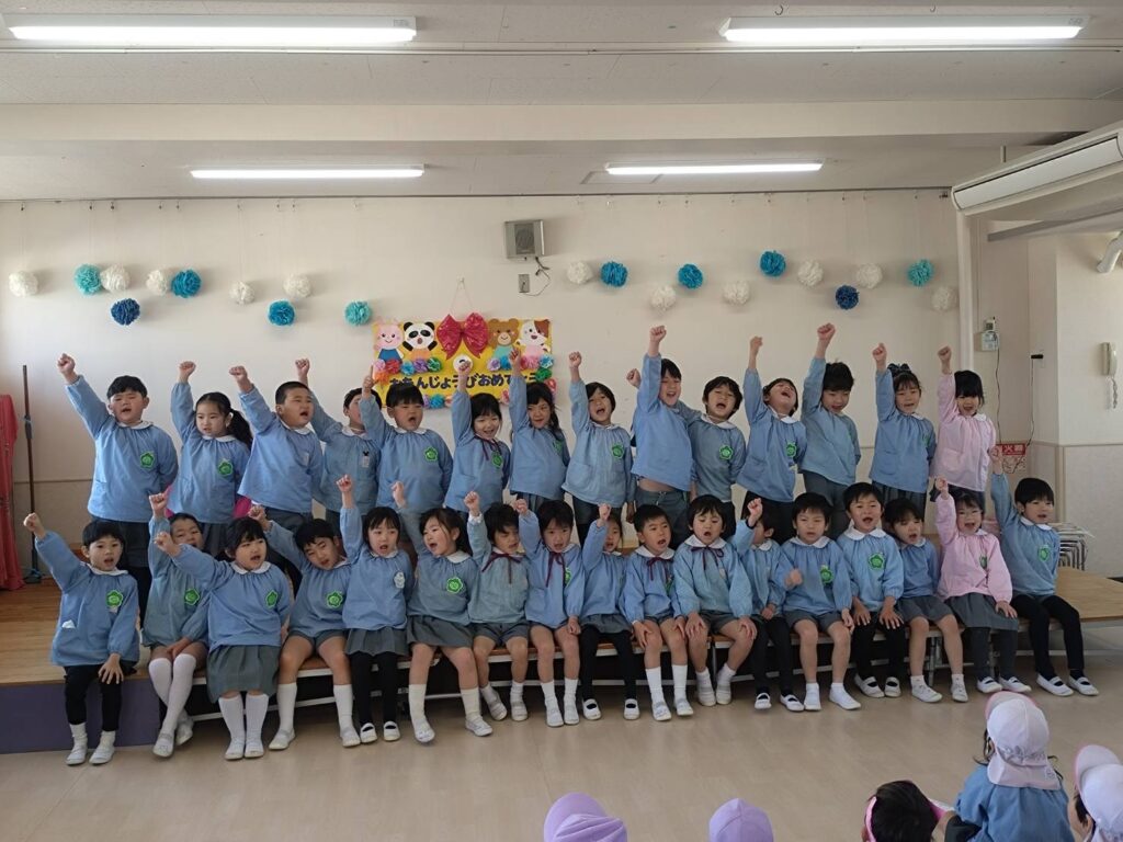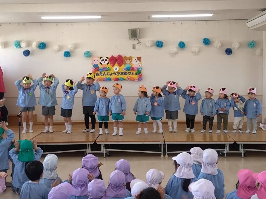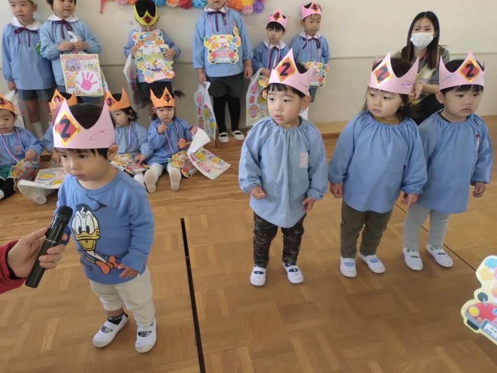 3月 お誕生会(平野愛和学園) 2026年3月21日 今年度最後のお誕生会!年長組の司会さんが大きな声で上手に進行してくれましたよ。 お誕生児さんは、名前、年齢、将来の夢を元気いっぱい発表してくれました。ミッキーマウスのダンスも頑張って踊ってくれました! お誕生会終了後は、もうすぐ卒園を迎える年長組とのお別れ会もしました。みんなで挨拶をしてから歌をうたってくれました♪年長組のうたが上手で、みんな真剣な表情で聞き入っていましたよ。 ☆子ども達から年長組さんに質問してみました☆◎保育園で楽しかった事は何ですか? ・文字のお稽古 ・運動会や発表会 ・ドッジボール大会 ・お絵描き ・戸外遊び◎1年生になったら、何をしたいですか? ・お友達を作る ・お勉強を頑張る◎お勉強は何をしますか? ・こくご ・さんすう ・かんじ ・テストもあるよ~みんな、少し照れながらも目をキラキラさせながらしっかりと答えてくれましたよ。愛和学園での生活もあと少しです。みんなでたくさん遊んで楽しい思い出を作ろうね♡