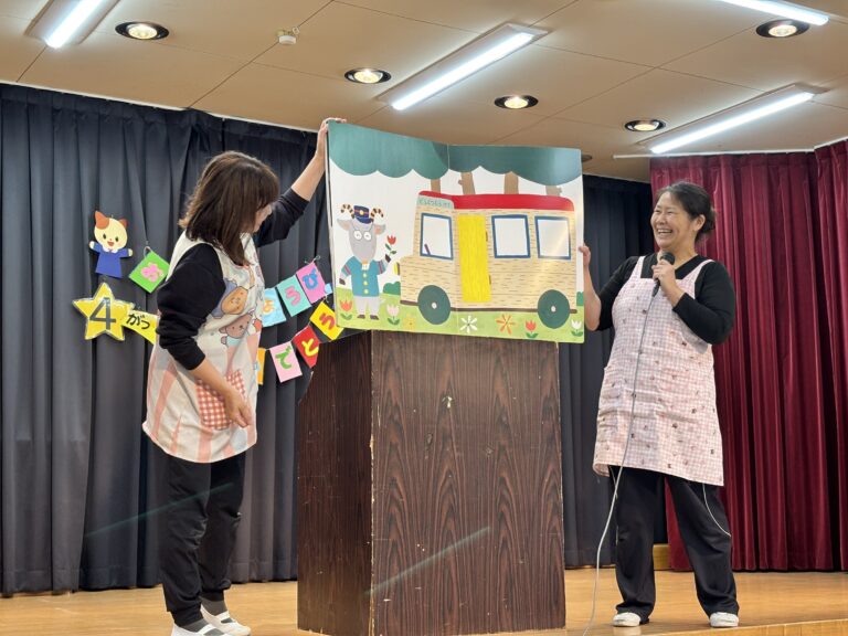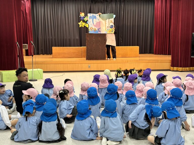 保育士の出し物、大きな絵本「みんなを乗せてバスプップー!」を真剣に見ていました。